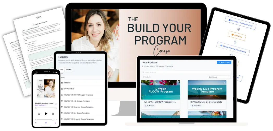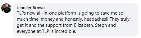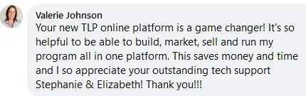 The TLP Tech software has everything you need, including video tutorials, step by step implementation process, access to experts and systems for marketing, lead magnet templates and all of the tech to get rolling with your business for online groups and courses, etc.